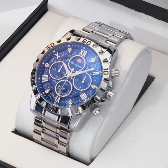Diese Herrenuhr vereint zeitlose Eleganz mit moderner Ausdruckskraft – gemacht für Männer, die Stil mit Substanz verbinden. Das Edelstahlgehäuse mit passendem Gliederarmband sorgt für markante Präsenz und hohen Tragekomfort – perfekt für Business, Freizeit und besondere Anlässe.