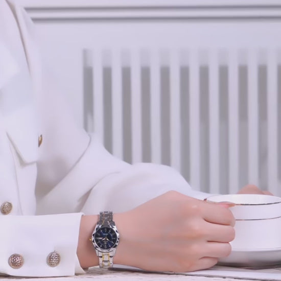 Das fein gestaltete Zifferblatt kombiniert funkelnde Akzente mit goldenen Details und einer eleganten Tages- und Datumsanzeige. Die klaren Linien und die raffinierte Geometrie schaffen ein harmonisches Gesamtbild. Ein zuverlässiges Quarzwerk sorgt für präzise Zeitmessung, während kratzfestes Glas und Leuchtzeiger eine optimale Ablesbarkeit gewährleisten – bei Tag und Nacht.