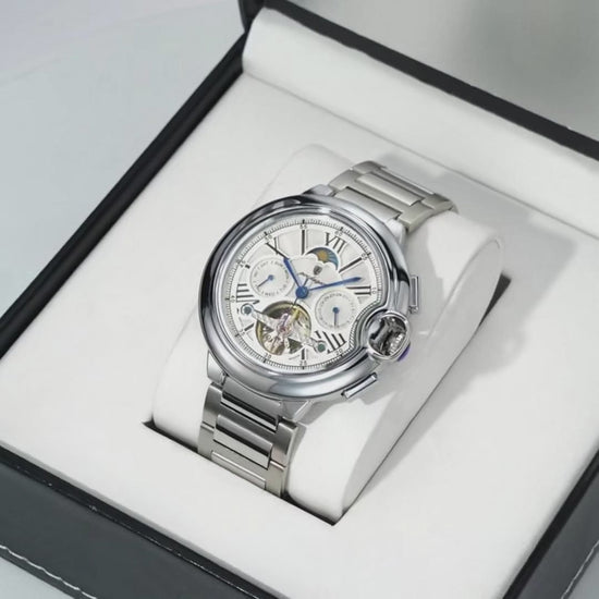 Diese streng limitierte Herrenuhr wurde für Männer geschaffen, die Präzision, Stil und Individualität auf höchstem Niveau schätzen. Das kraftvolle Edelstahlgehäuse schützt ein automatisches Uhrwerk, das ganz ohne Batterie durch Bewegung angetrieben wird – zuverlässig, langlebig, mechanisch perfekt.