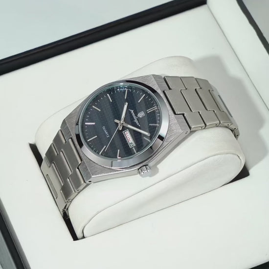 Diese Uhr ist gemacht für Männer, die Eleganz mit Widerstandskraft verbinden. Das massive Edelstahlgehäuse und das robuste Armband vereinen sportliche Funktionalität mit markanter Optik – ideal für Alltag, Business und aktive Herausforderungen.