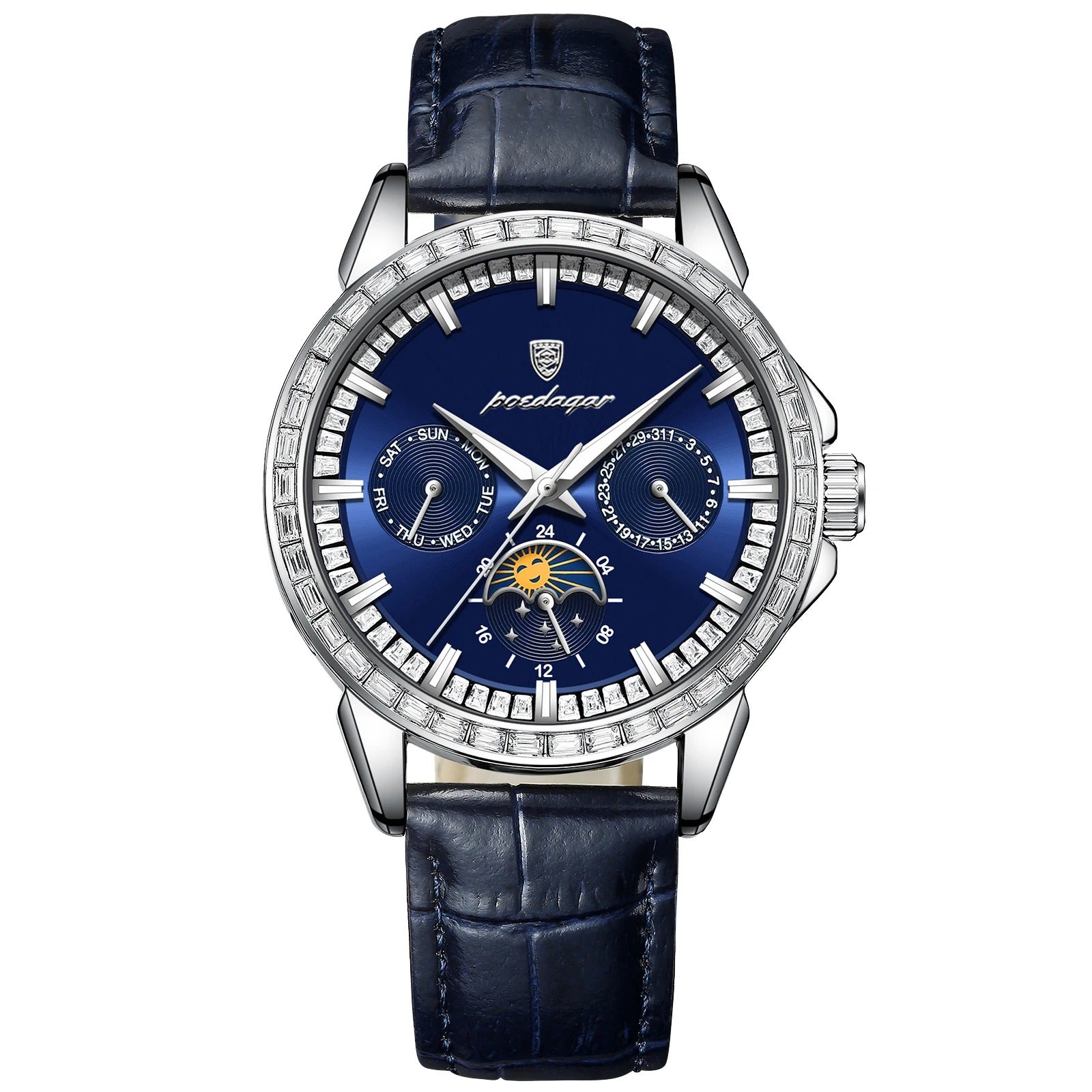 Das tiefblaue Zifferblatt bietet Wochentags-, Datums- und Mondphasenanzeige – funktional und eindrucksvoll. Glitzernde Kristalle auf der Lünette setzen dezente Highlights. Im Inneren sorgt ein präzises Quarzwerk für zuverlässige Zeitmessung.