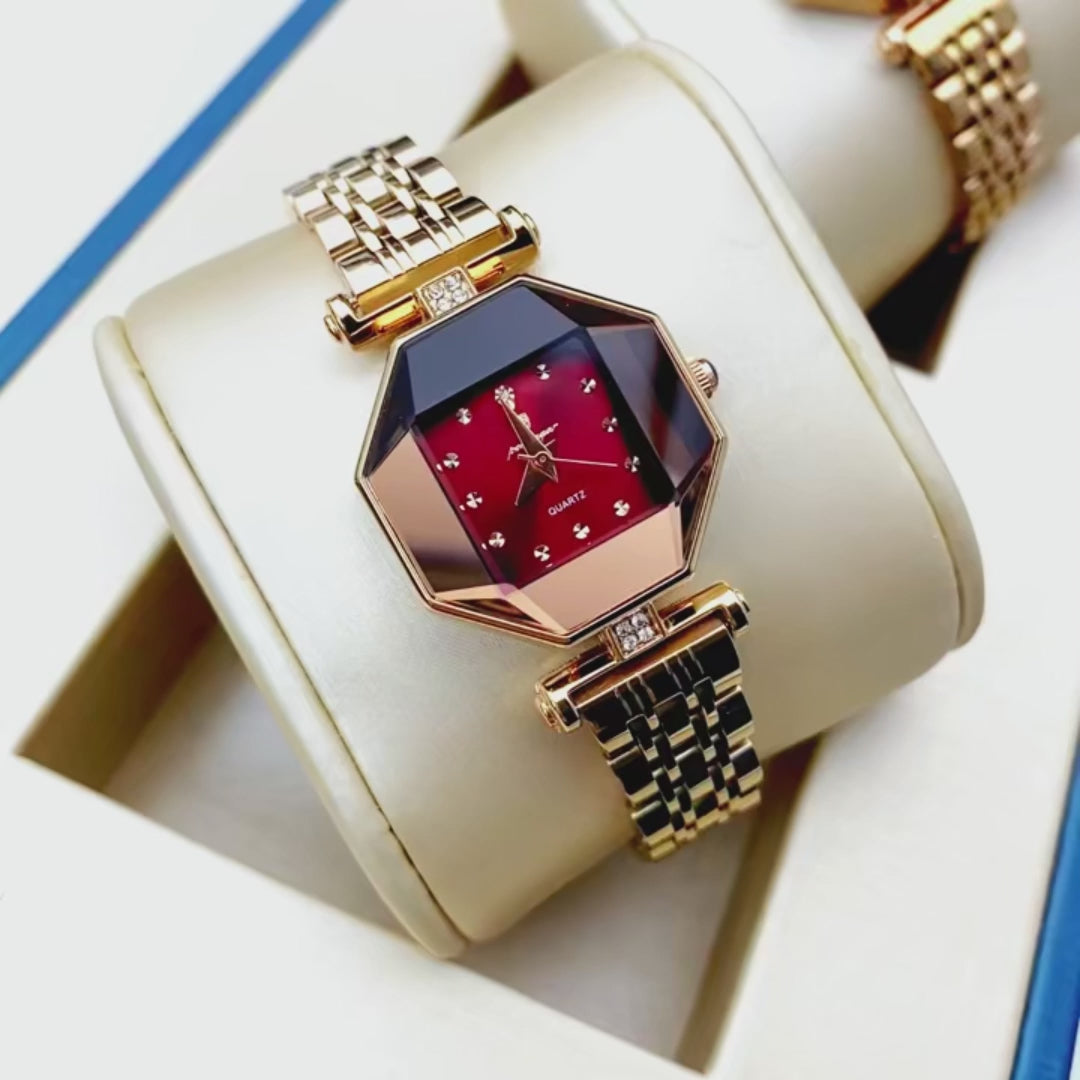 Das rubinrote Zifferblatt mit funkelnden Indizes und diamantähnlichen Akzenten sorgt für Tiefe und Eleganz. Die einzigartige Gehäuseform setzt ein markantes Statement, während das präzise Quarzwerk für zuverlässige Zeitmessung steht. Kratzfestes Glas rundet das hochwertige Gesamtbild ab.