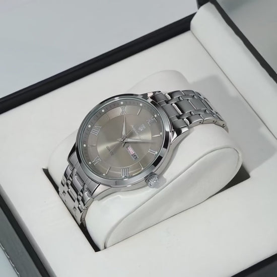 Das ausdrucksstarke Zifferblatt mit feinen Details verleiht starke Ästhetik. Das massive Gehäuse schützt ein präzises Quarzwerk, während kratzfestes Glas und solide Wasserdichtigkeit sie zu einem verlässlichen Begleiter machen.