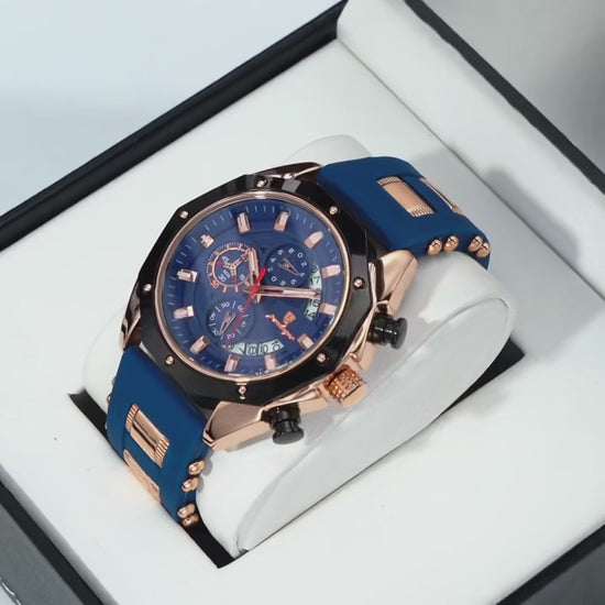 Das Zifferblatt überzeugt mit kraftvollem Design, gut sichtbarer Datums- und Wochentagsanzeige sowie leuchtenden Zeigern für optimale Lesbarkeit – bei Tag und Nacht. Im Inneren arbeitet ein präzises Quarzwerk, geschützt durch kratzfestes Glas.